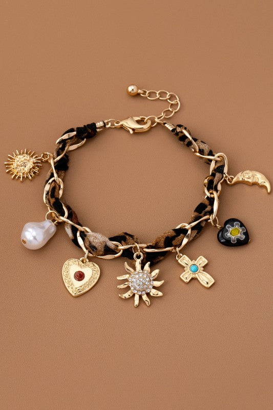 A silky animal-print band meets meaningful, eye-catching details. This bracelet features a mix of symbolic charms—a cross, moon, heart, sunburst, and pearl accents—creating a stylish piece that feels both bold and feminine. Wear it solo as a statement or stack it with your everyday favorites.