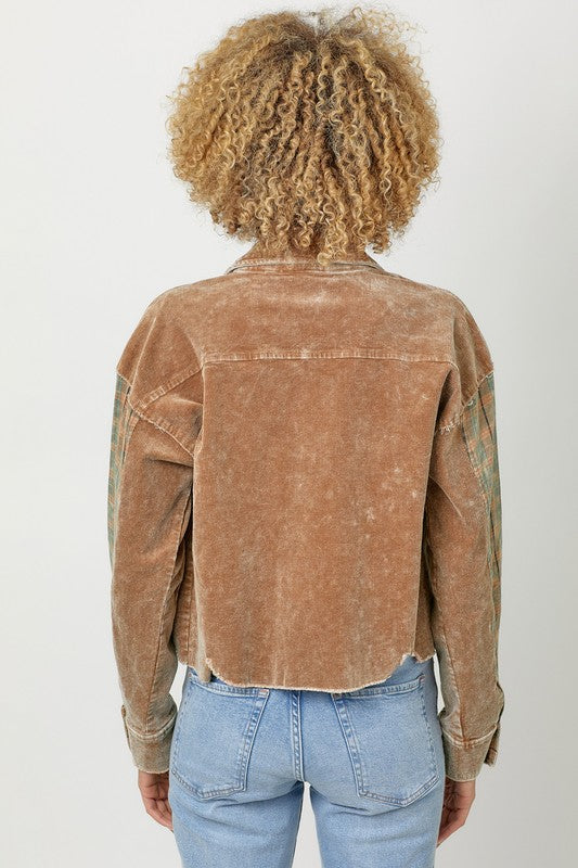 A little vintage, a little edgy — and a whole lot of cute. This contrasting plaid + corduroy jacket features a cropped fit with distressed hem cut-outs, bust pocket detail, and a button-down front for easy layering. The perfect throw-on piece for tees, tanks, dresses, joggers — literally everything.