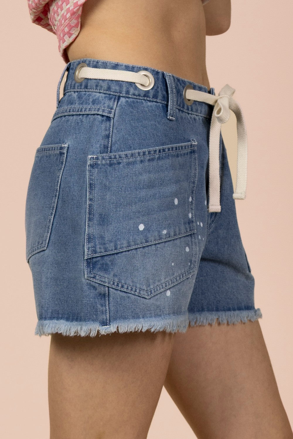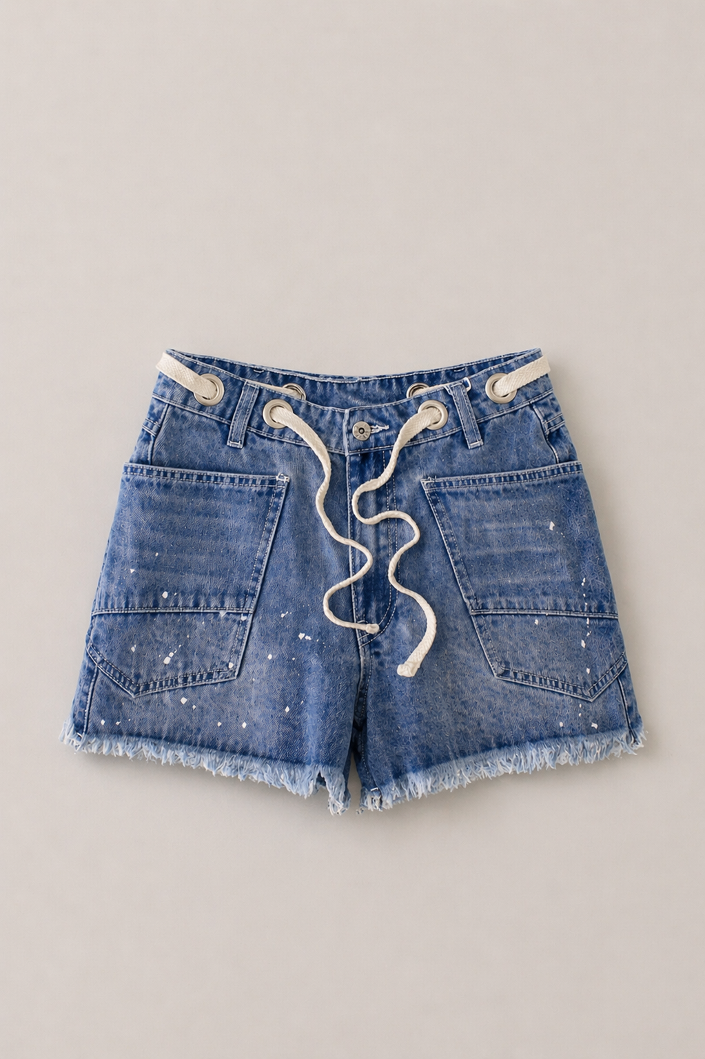 Easygoing denim shorts designed for laid-back summer days. These medium wash shorts feature subtle paint splatter details, oversized grommets, and a rope drawstring waistband for an adjustable, relaxed fit. Finished with utility-style patch pockets and frayed hems for that perfectly worn-in, effortless vibe.